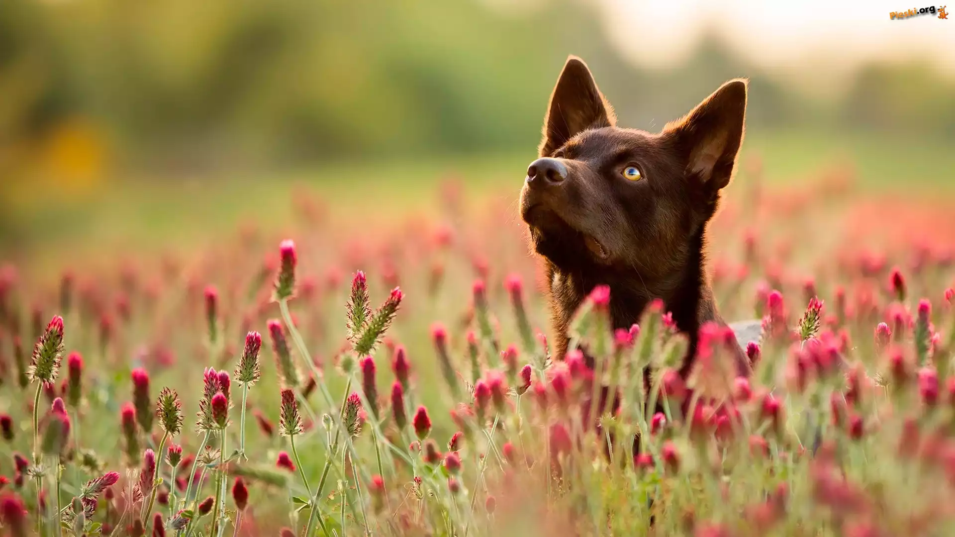 Łąka, Mordka, Pies, Owczarek australijski kelpie, Kwiaty Owczarek australijski Kelpie, Mordka Brązowy, Owczarek australijski - Kelpie fale, piasek, Owczarek australijski - Kelpie Cztery, Owczarki australijskie - Kelpie Owczarek australijski - Kelpie, Szczeniak