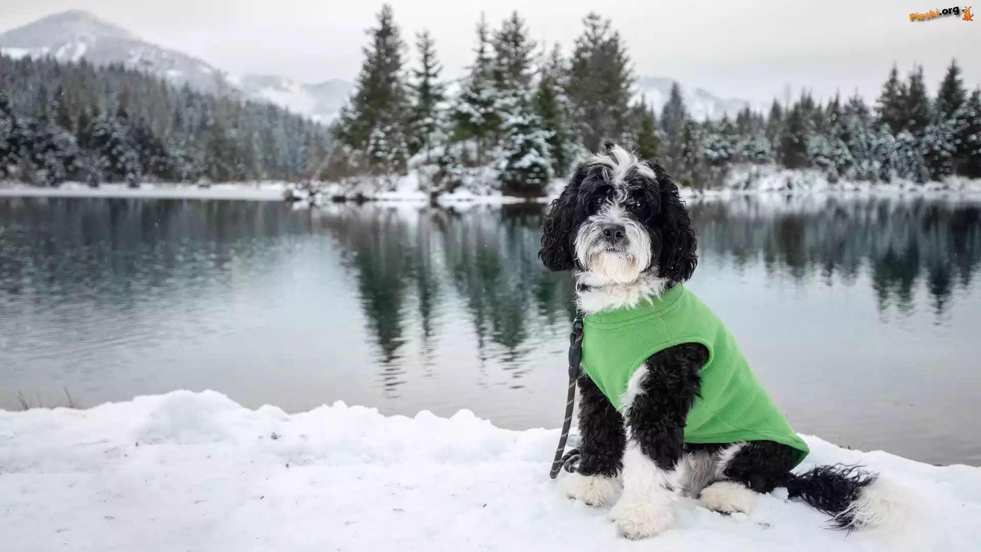 Czarno-biały, Ubranko, Zielone, Pies, Smycz, Zima