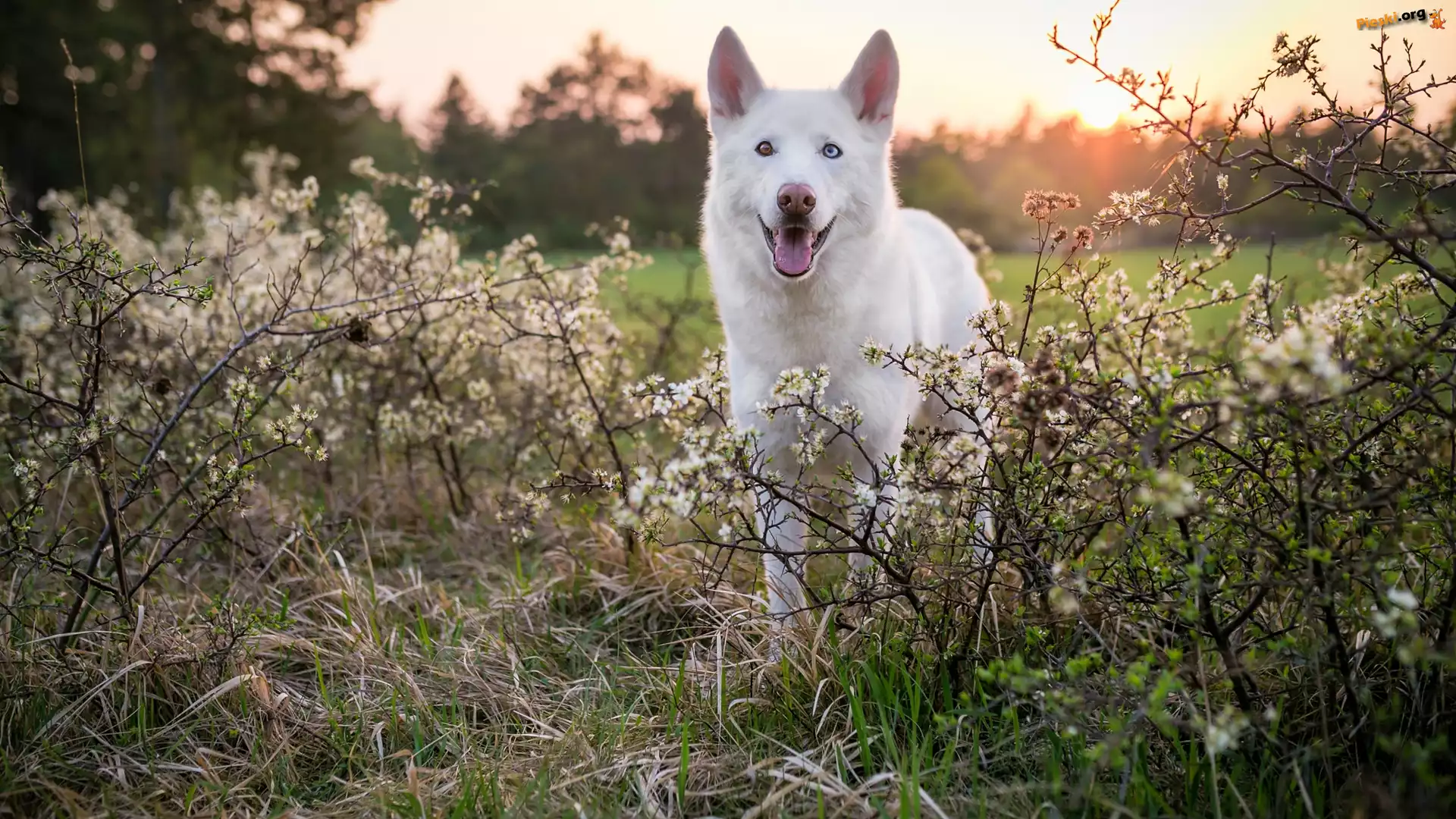Krzewy, Biały owczarek szwajcarski, Pies, Trawa, Kwiaty