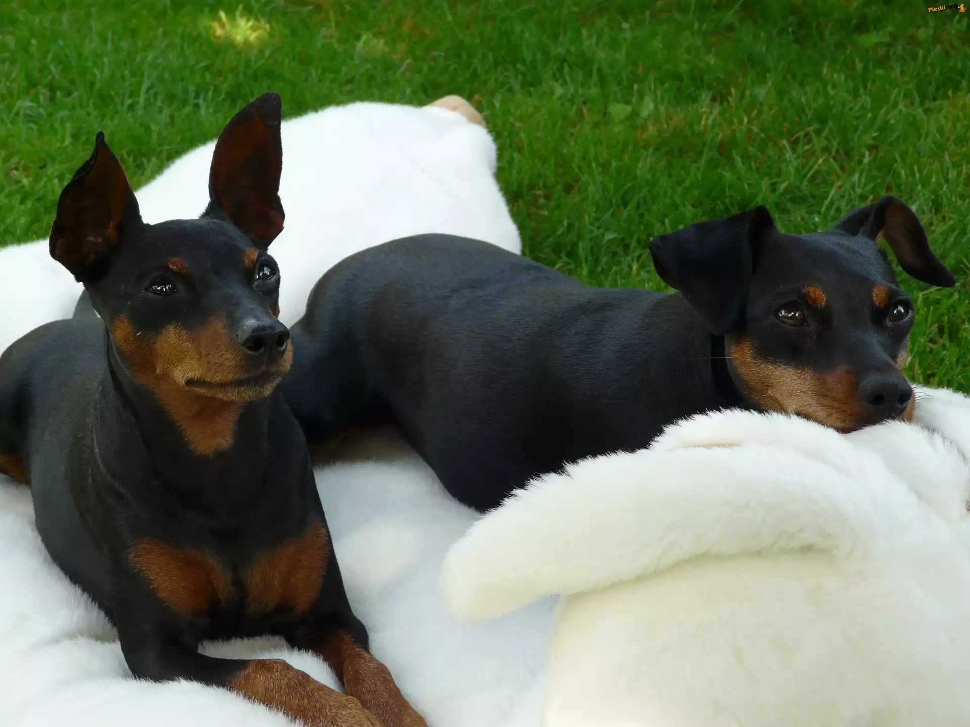biały, dwa, Pinczery miniaturowe, koc Rośliny, Pinczer miniaturowy, Pies, Drzewo, Liście Pinczer miniaturowy, postawione, uszy Pinczer miniaturowy pysk, Pinczer miniaturowy Pinczer miniaturowy, szczeniaki, trzy, czarne trawa, Pinczer miniaturowy, czarny Uszy, Pies, Długie, Obroża, Pinczer miniaturowy, Mordka, Stojące Pies, Pinczer miniaturowy, Woda Pies, Pinczer miniaturowy, Kwiaty Rottweiler, Pinczer miniaturowy