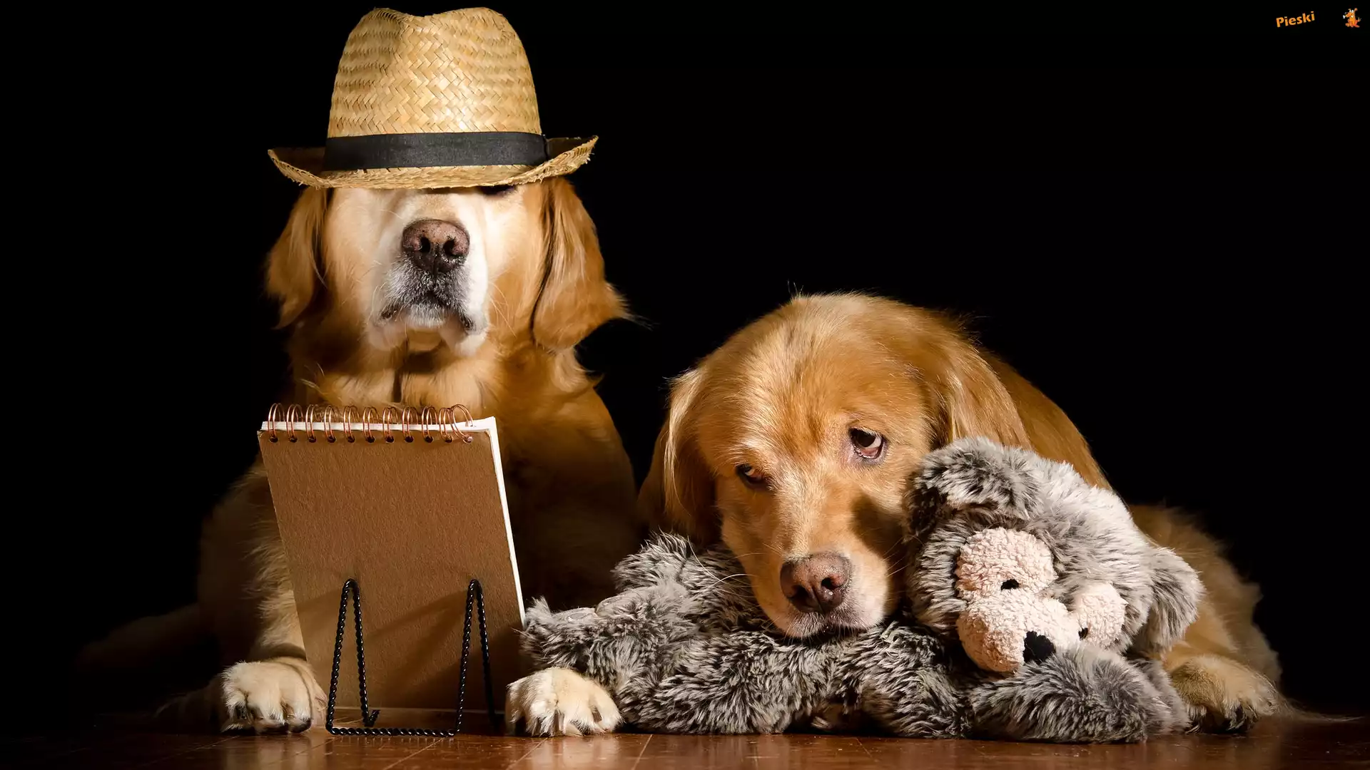 Dwa, Brulion, Kapelusz, Psy, Golden retriever, Pluszak, Pieski