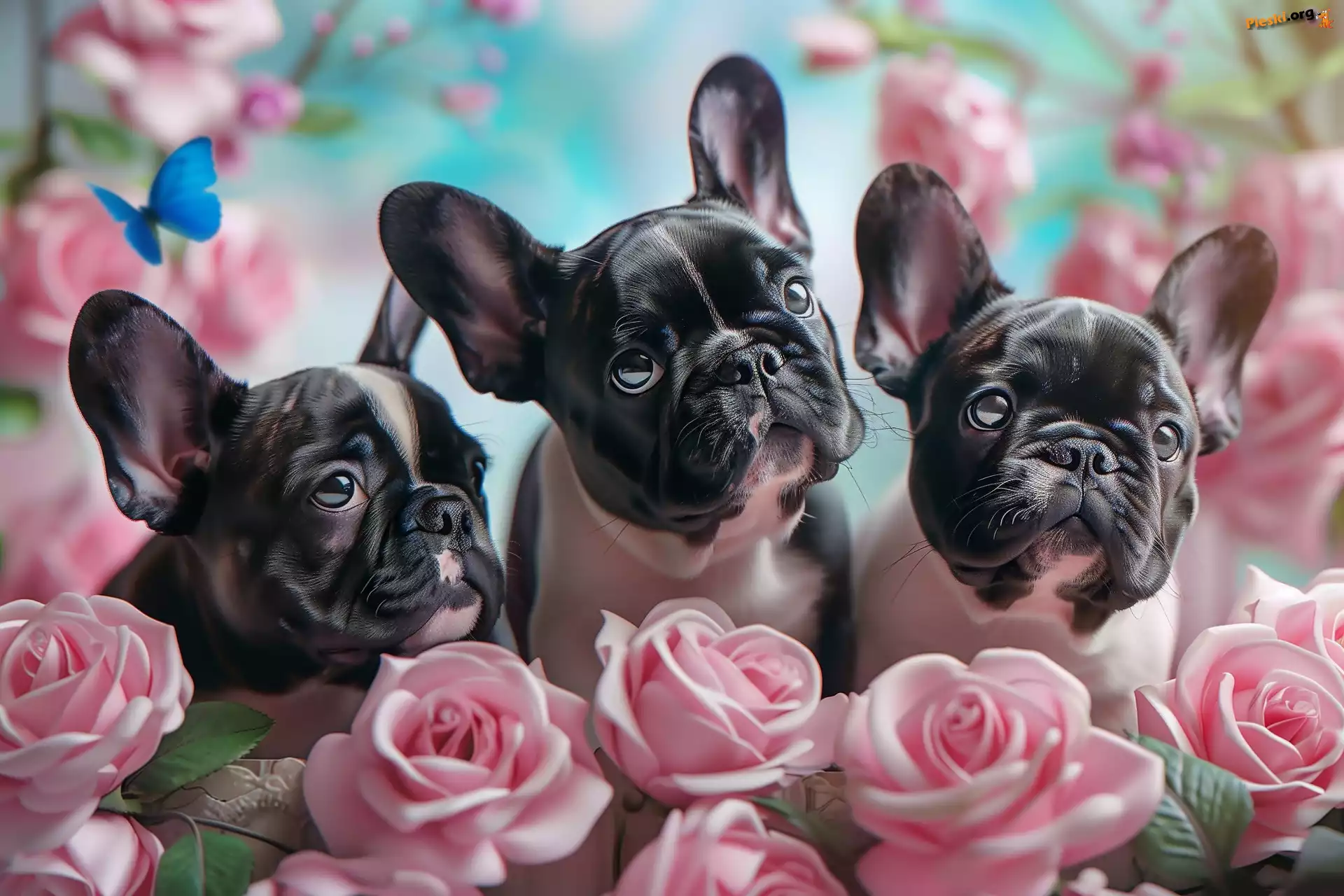 Grafika, Trzy, Psy, Buldog francuski, Kwiaty, Róże