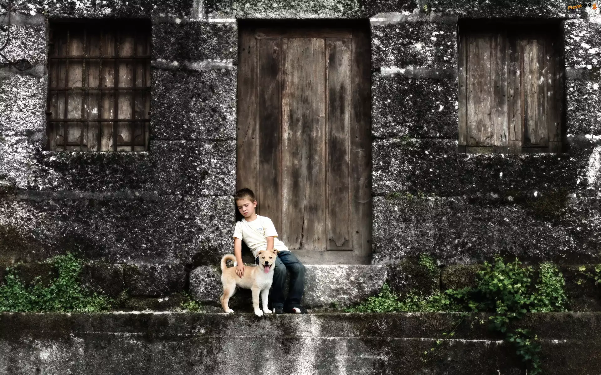 Chłopiec, Dom, Drzwi, Pies, Pieski