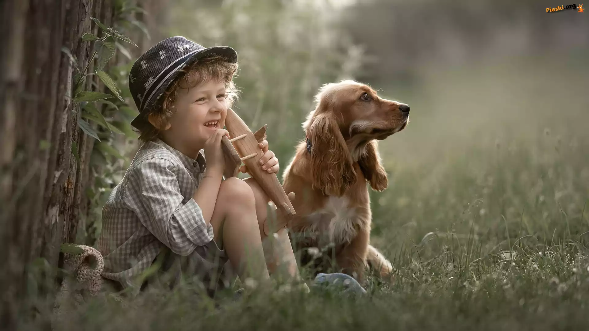 Chłopiec, Pies, Cocker spaniel angielski, Pieski