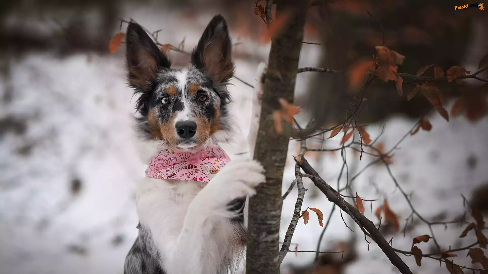 Drzewo, Pies, Border collie, Zima, Pieski