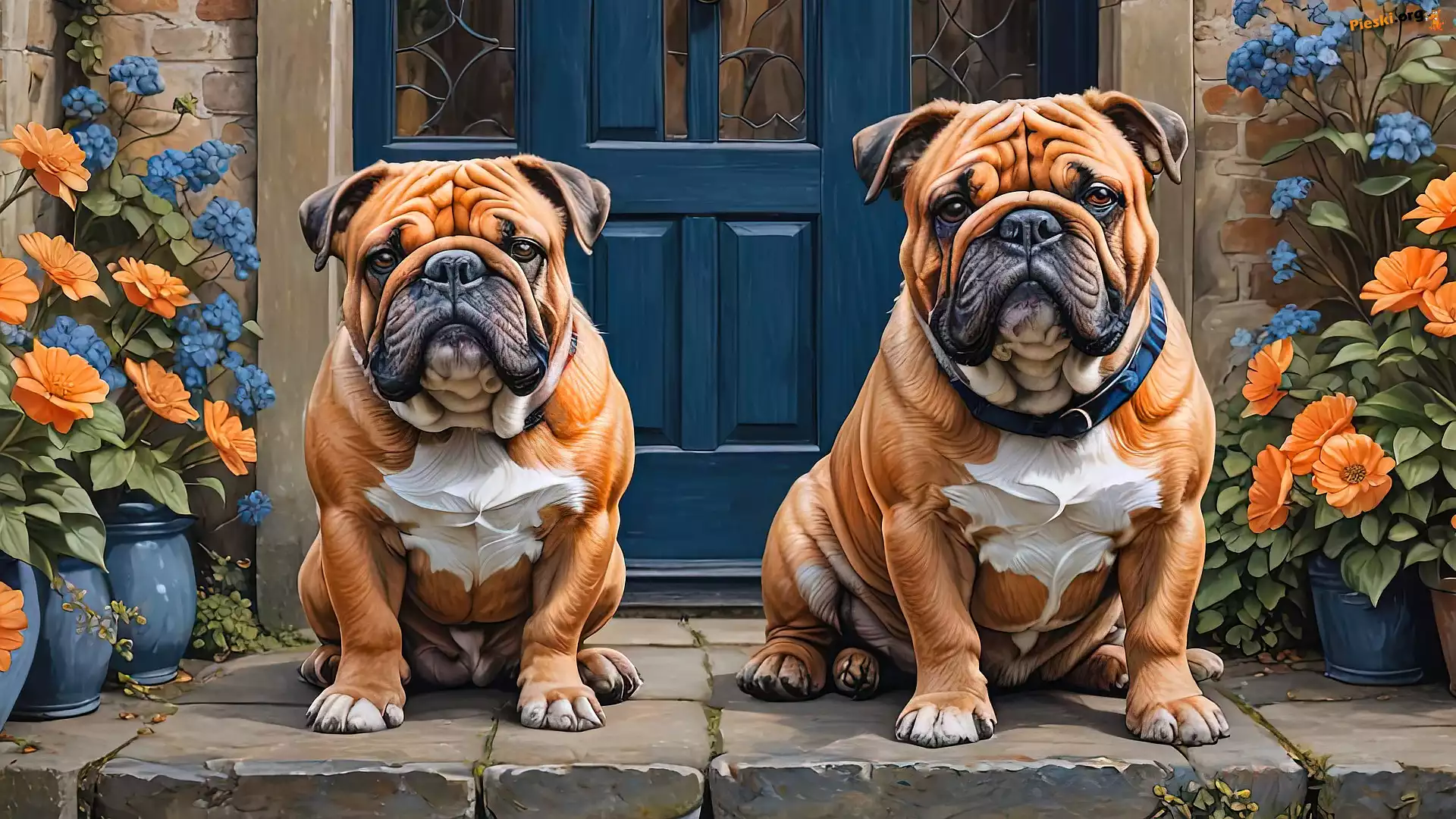 Psy, Kwiaty, Dwa, Drzwi, Buldogi angielskie, Pieski