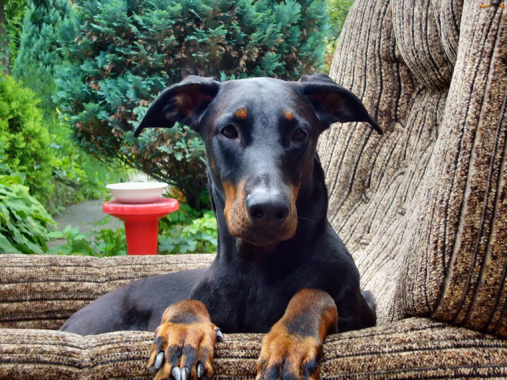 Doberman, Spojrzenie, Obroża Bronzowy, Doberman Mały, Duży, Doberman, Pinczer Doberman Doberman, Mordka, Pies, Brązowy, Wrzosy Czarne, Pies, Doberman, Tło Fotelu, Doberman, W, Pysk Czarne, Doberman, Pies, Światła, Tło Szalik, Pies, Doberman, Kładka