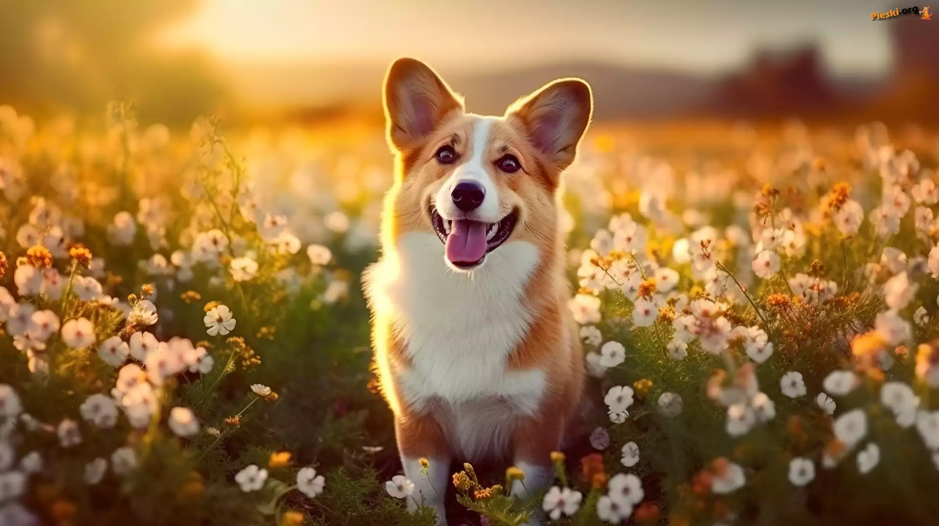 Spojrzenie, Łąka, Pies, Kwiaty, Welsh corgi pembroke, Pieski