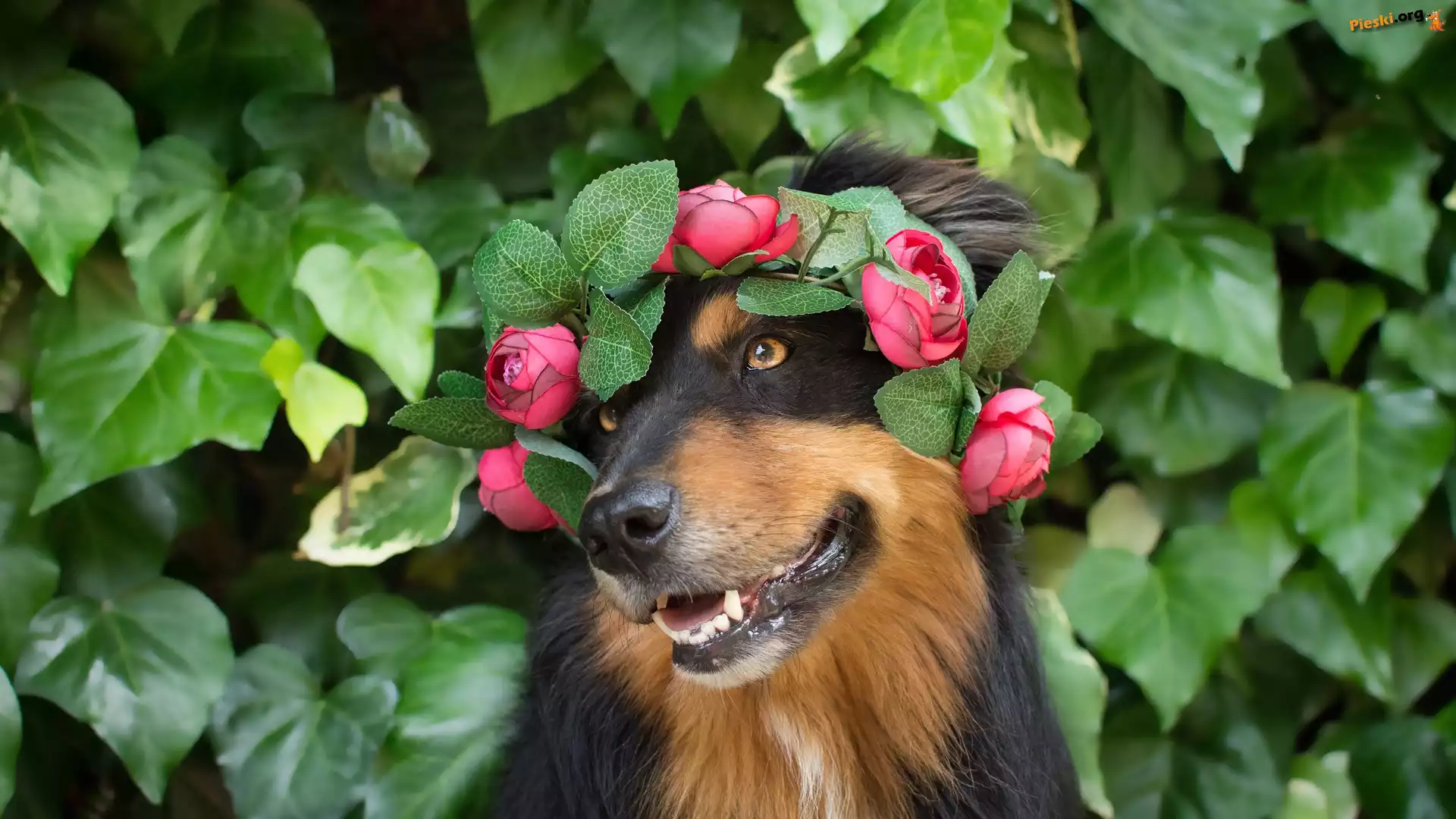 Pies, Kwiaty, Wianek, Owczarek australijski, Mordka, Liście, Pieski