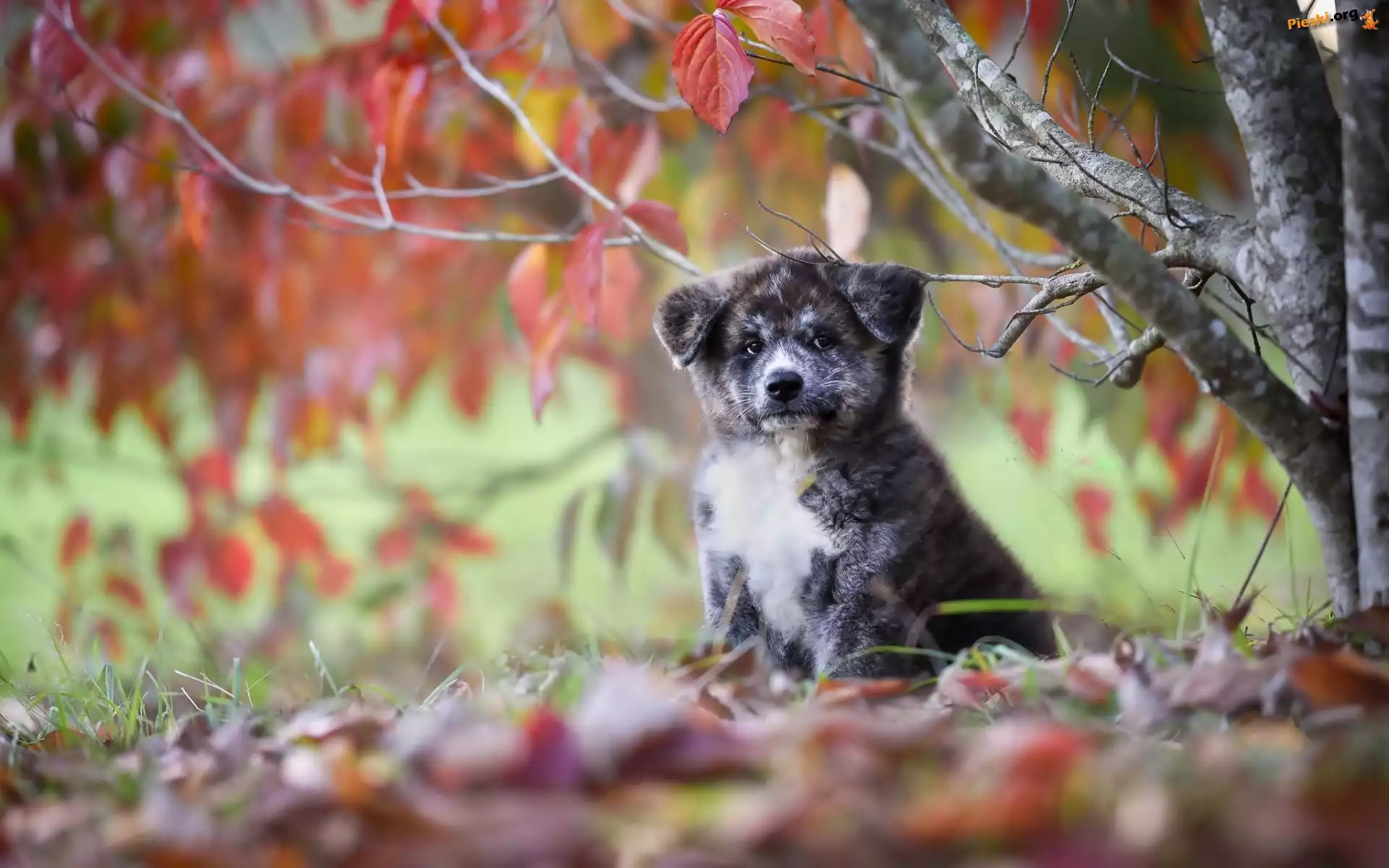 Liście, Akita inu, Szczeniaczek, Drzewo, Jesień, Pieski