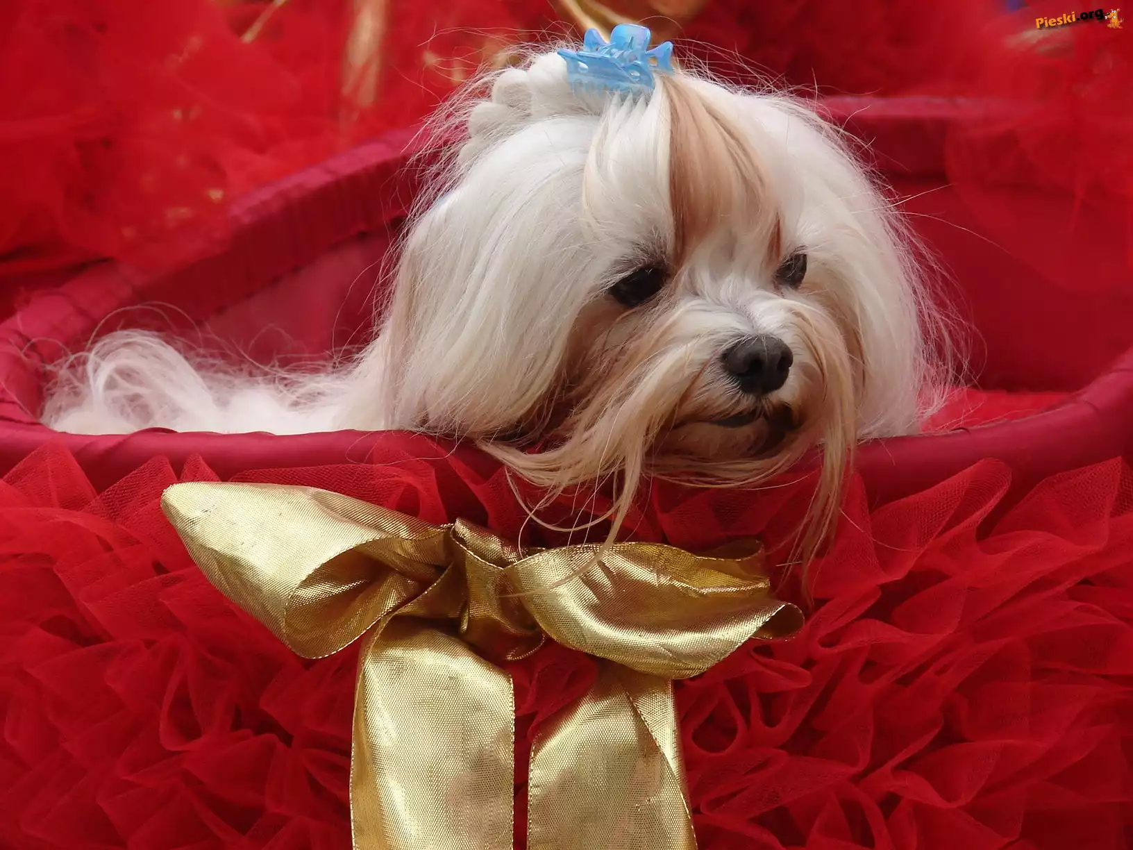Pies, Różowa, Gerbera, Lhasa Apso wyczesany, Lhasa Apso Malutki piesek, Lhasa Apso Lana Del Rey, Pies, Lhasa Apso Lhasa Apso, kokardka