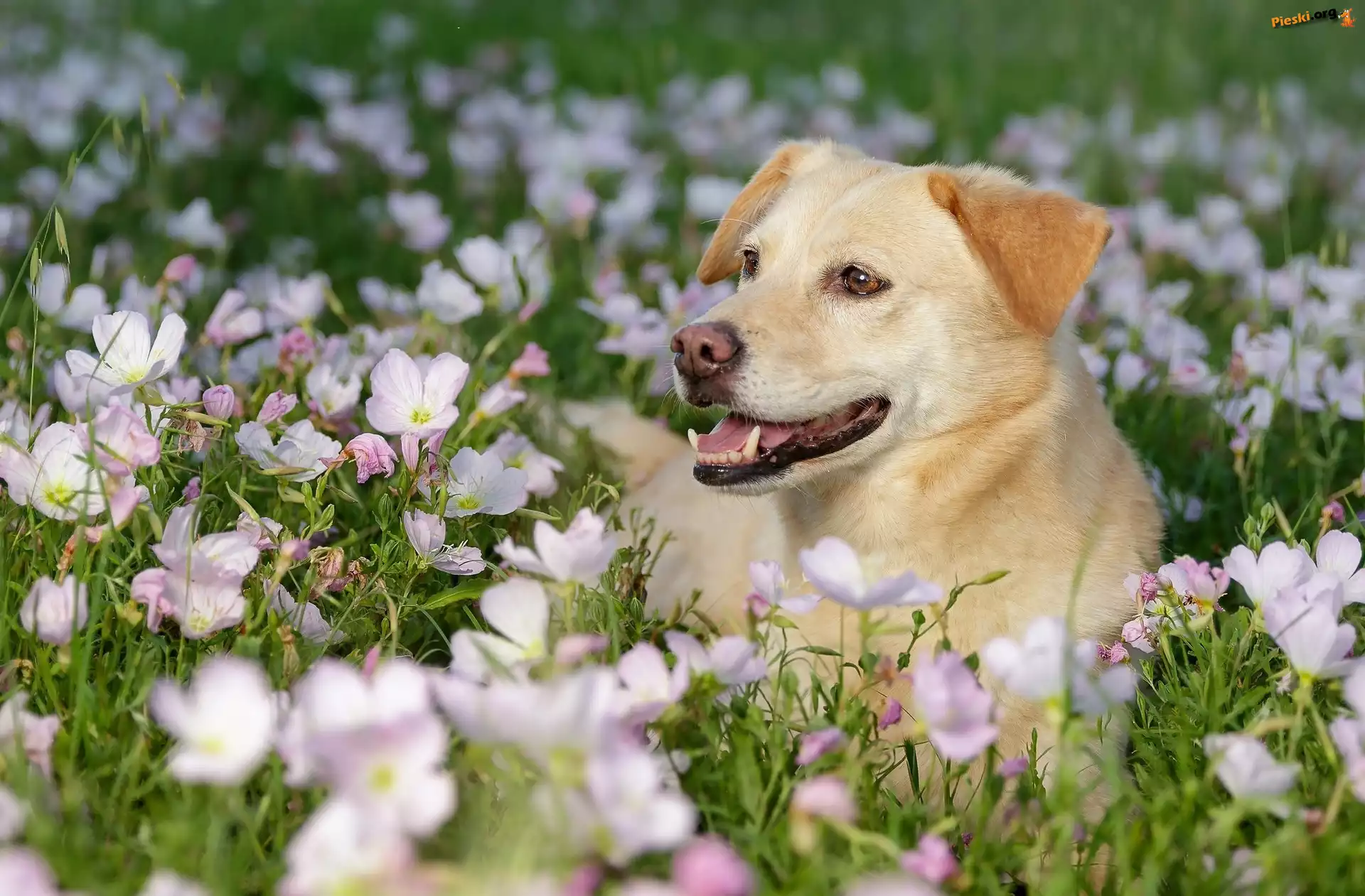 Leżący, Pies, Kwiaty, Pieski