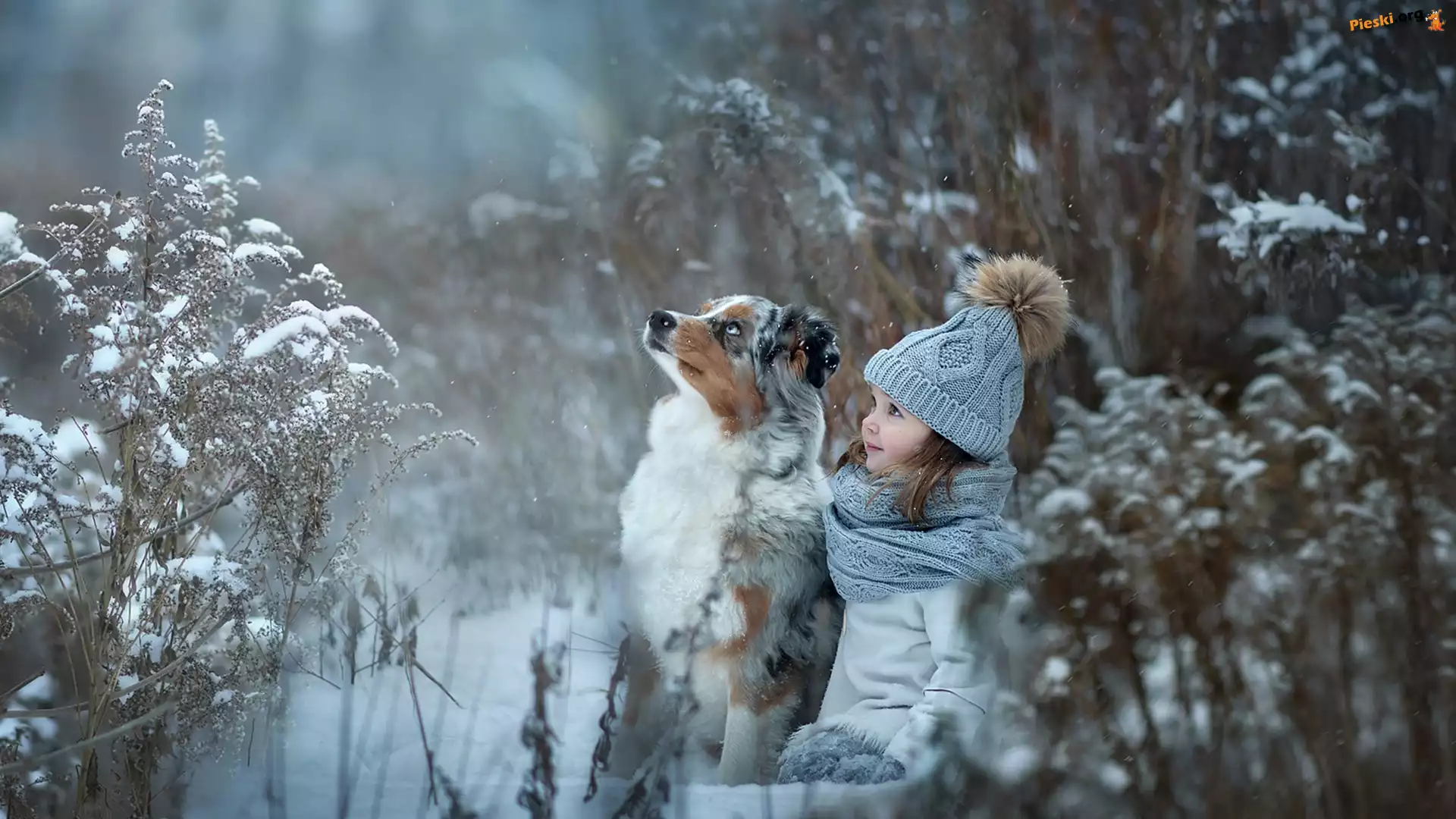 Rośliny, Pies, Zima, Dziecko, Owczarek australijski, Dziewczynka, Śnieg, Pieski