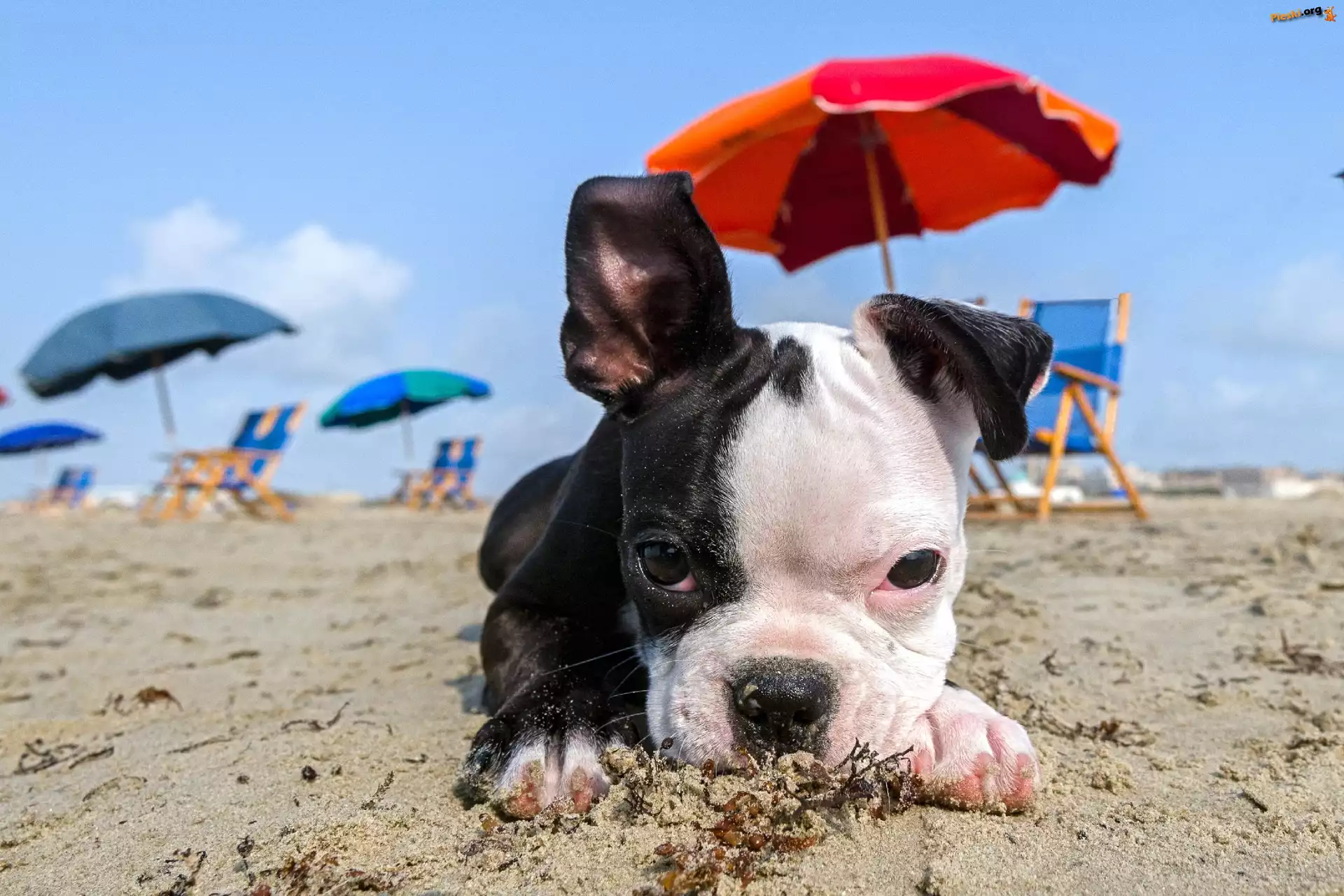 Parasole, Szczeniaczek, Plaża, Mops, Pieski