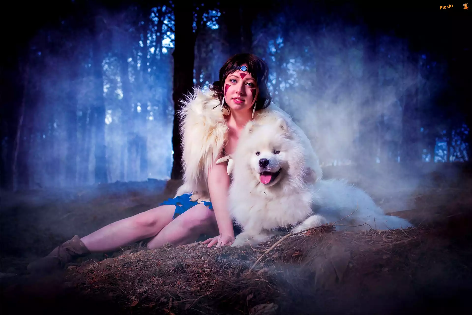 Samojed, Kobieta, Pies, Las, Pieski