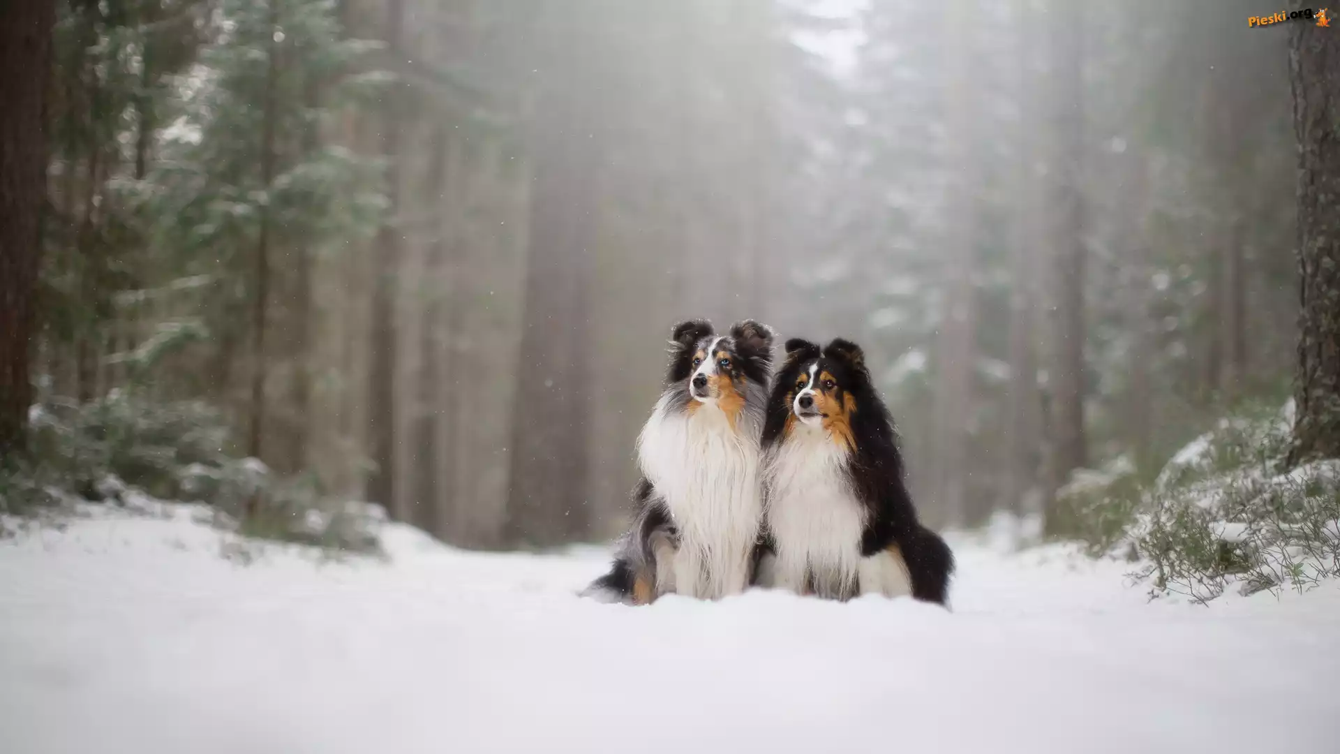 Śnieg, Psy, Owczarki szetlandzkie, Las