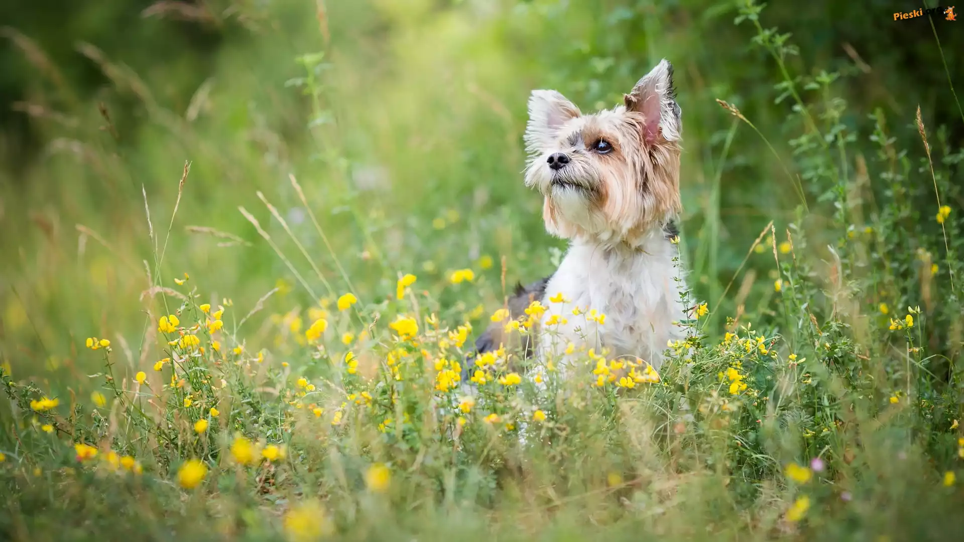 Żółte, Pies, Yorkshire terrier, Kwiaty, Pieski