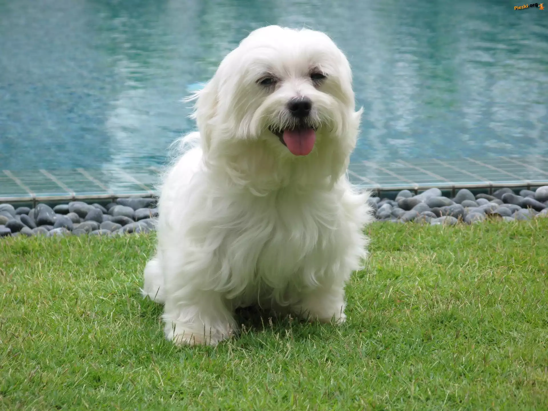 Szczeniak, Biały, Pies, Coton de Tulear Coton de Tulear, fotel Piesek, Coton de Tulear, Łąka Kokardka, Coton de Tulear, Piesek Dwa, Coton de Tulear Biały, Coton de Tulear Trawa, Biały, Piesek, Basen Młoda, Kobieta, Pies