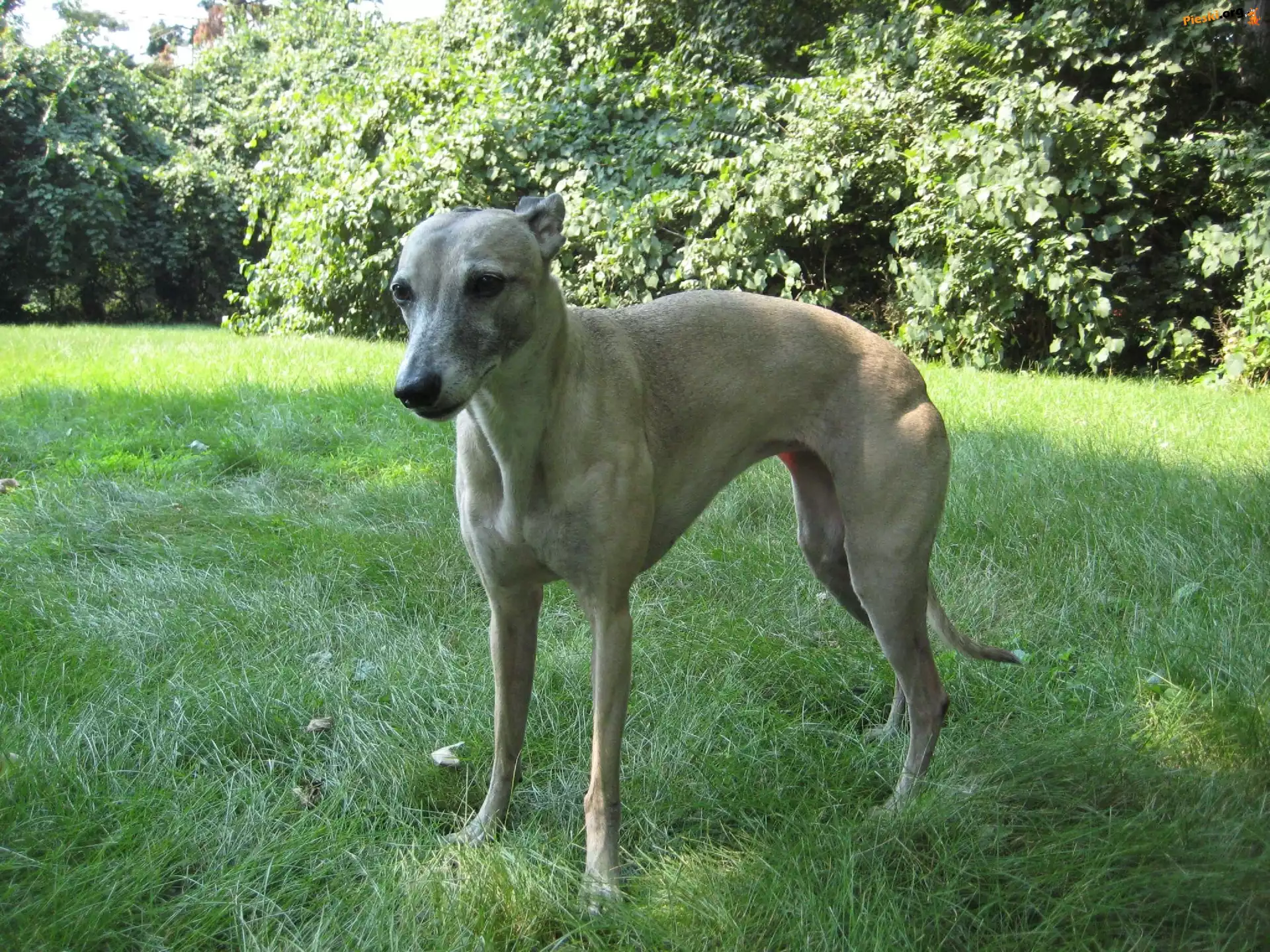 Whippet Whippet, różowe, ubranko Whippet, zielona, trawa Whippet, zielone, liście